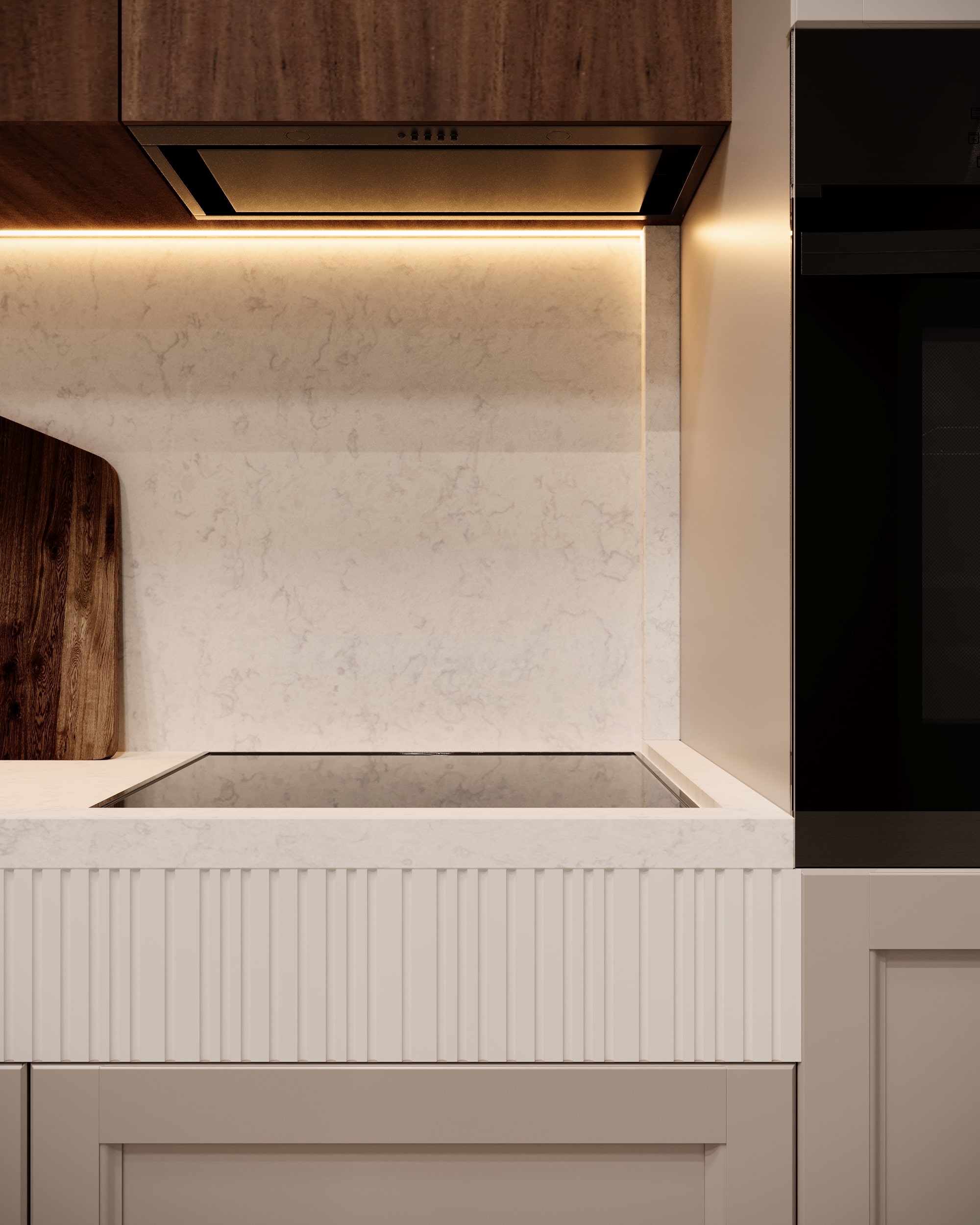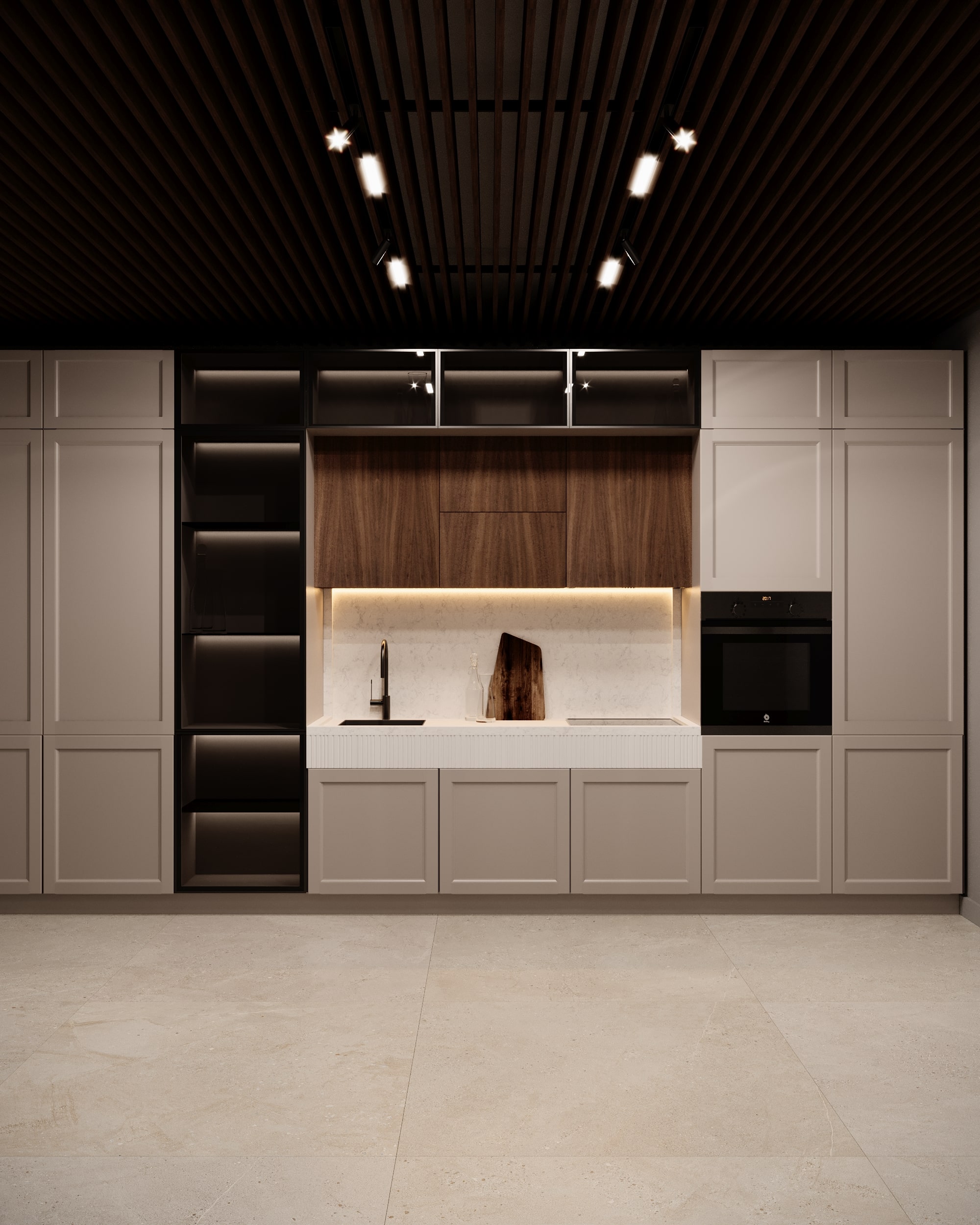Modelul prezentat in imagini conține: fronturi riflate alb RAL9003, fronturi din MDF vopsit beige ICA0124, fronturi suspendate cu MDF furniruit Noce Canaletto (finisaj special)