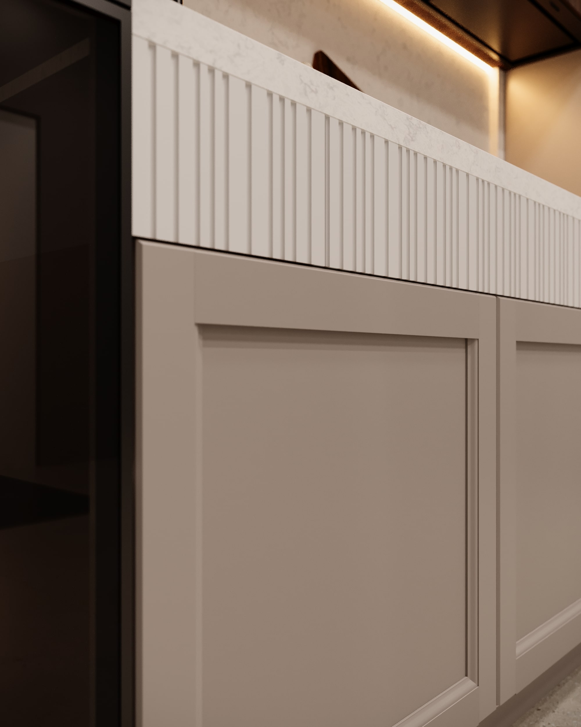 Sistemul este completat de fronturi riflate, realizate pentru a adăuga textură și continuitate vizuală, precum și de fronturi vitrate cu ramă metalică, ideale pentru integrarea zonelor de expunere sau pentru ușurarea compozițiilor volumetrice.