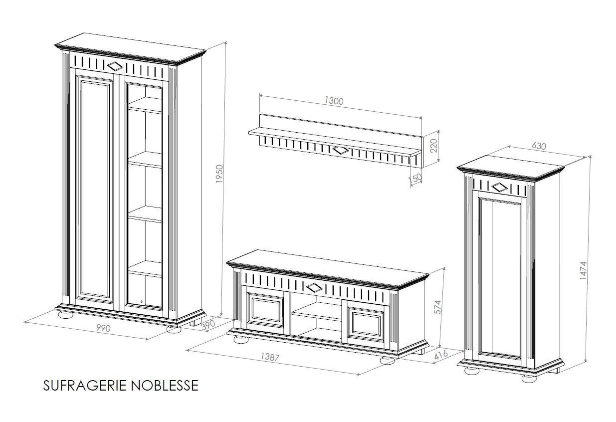 Construita integral din lemn masiv de brad cu un design elegant , ofera un spatiu de depozitare practic cu rafturi ce pot fii ajustate pe inaltime Dimensiunile totale : latime 291.0 cm, adancime 416.0 cm, inaltime 195.0 cm. Nu necesita asamblare. Face parte din Colectia Noblesse Dimensiuni vitrina mare: 100 x 39 x 195 cm (L x A x H) Dimensiuni comoda: 139 x 41.5 x 57.5 cm (L x A x H) Dimensiuni vitrina mica: 64 x 69 x 147.5 cm (L x A x H Dimensiuni polita: 130 x 15 x 22 cm (L x A x H)