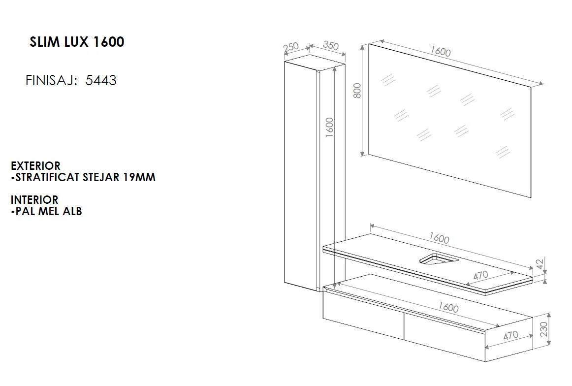 MF SLIM LUX BLAT 1600X470X57 MDF MAT ALB RAL 9003