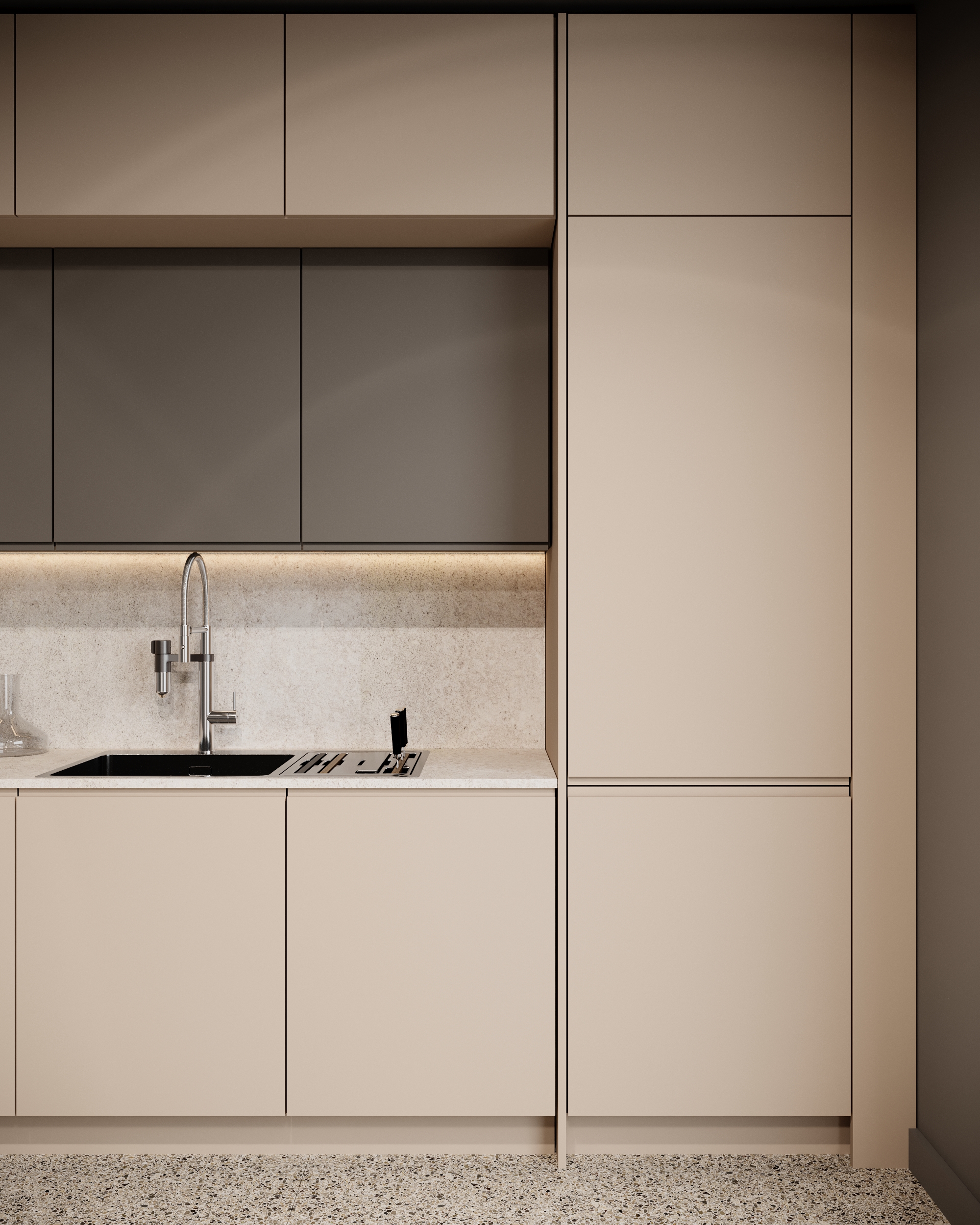 Colecția Modern by Terramob este construită în jurul utilizării fronturilor cu mâner frezat în cant, într-o geometrie specifică tip J. Acest tip de frezaj integrează o buza scurtă, ergonomică, care permite prinderea facilă cu degetele, eliminând necesitatea mânerelor aplicate. Particularitatea designului constă în faptul că frontul coboară până în blat, printr-o secțiune subțiată care contribuie la o percepție vizuală continuă.